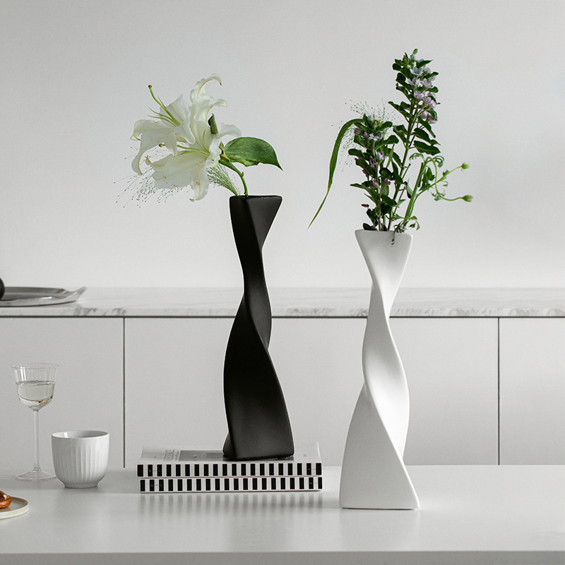 Home > Creative Floor Vase Tall Ceramic Vase Black And White Nordic Simple Spiral Vase Living Room Desktop Ceramic Ornaments Home Decor